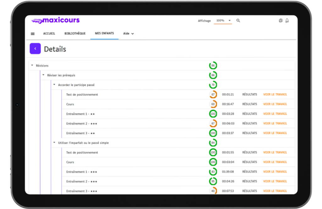 Un tableau de bord clair pour suivre les résultats et la progression de votre enfant en français en temps réel.