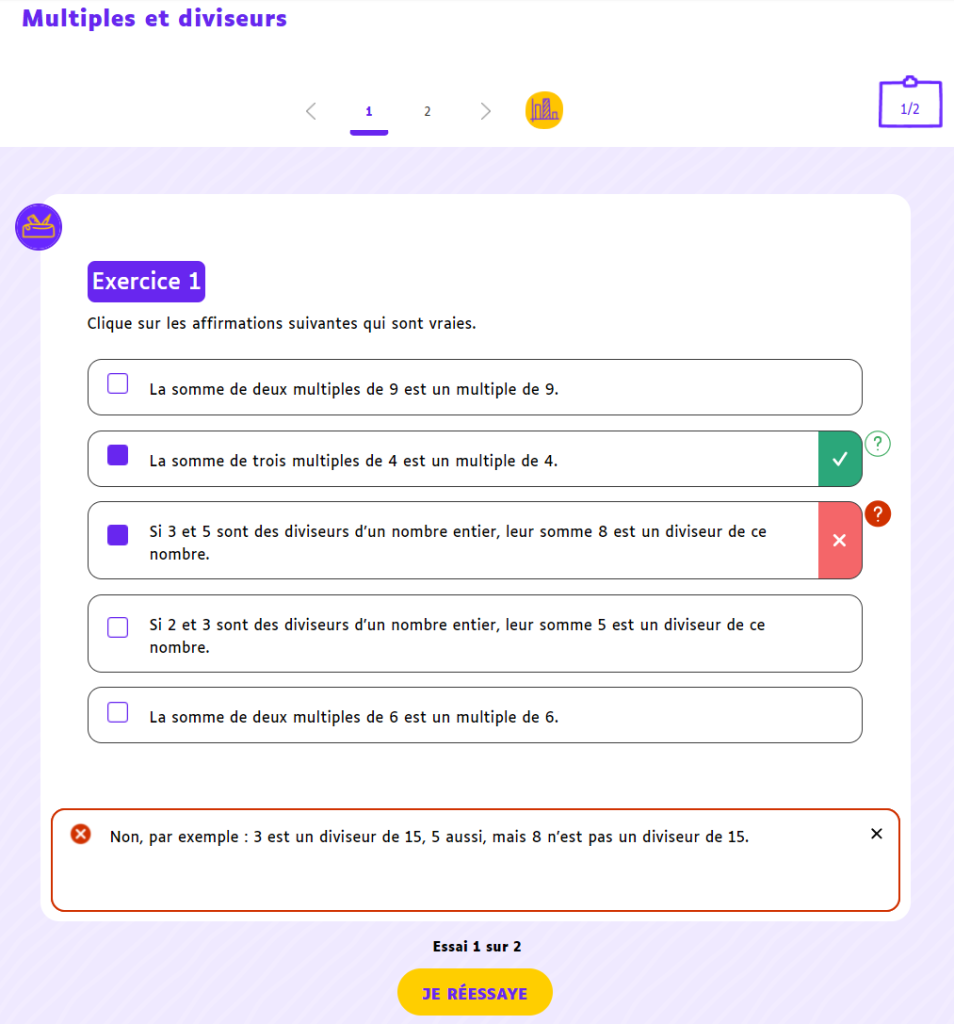 Au début de chaque chapitre, votre enfant effectue un test diagnostique qui évalue son niveau afin de lui proposer un parcours d’exercices adapté à son niveau réel.